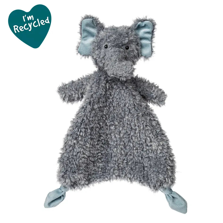 Elephant is a comforting cuddle toy with an under-stuffed body in textured grey fabric with knotted corners at the feet; lovey has a soft sculpted face with embroidered eyes.