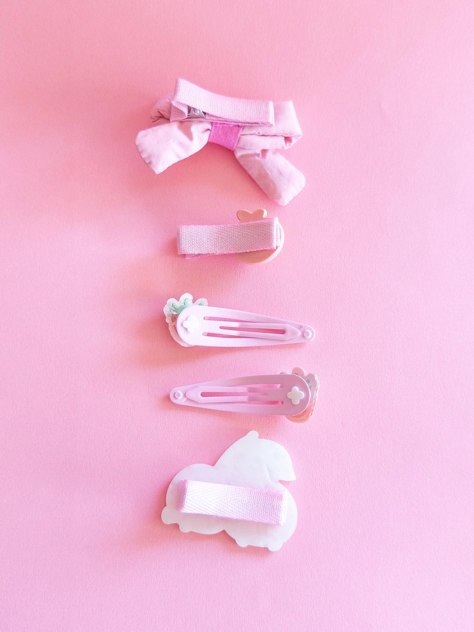 Add a pop of fruity fun to your hairstyle with our Twin Cherries Puffy Bow Set! This adorable 5-piece pink toned hair clip set features sweet and happy cartoon cherries, juicy fabric strawberry snap clips, a glossy plump peach, and a puffy pink bow.