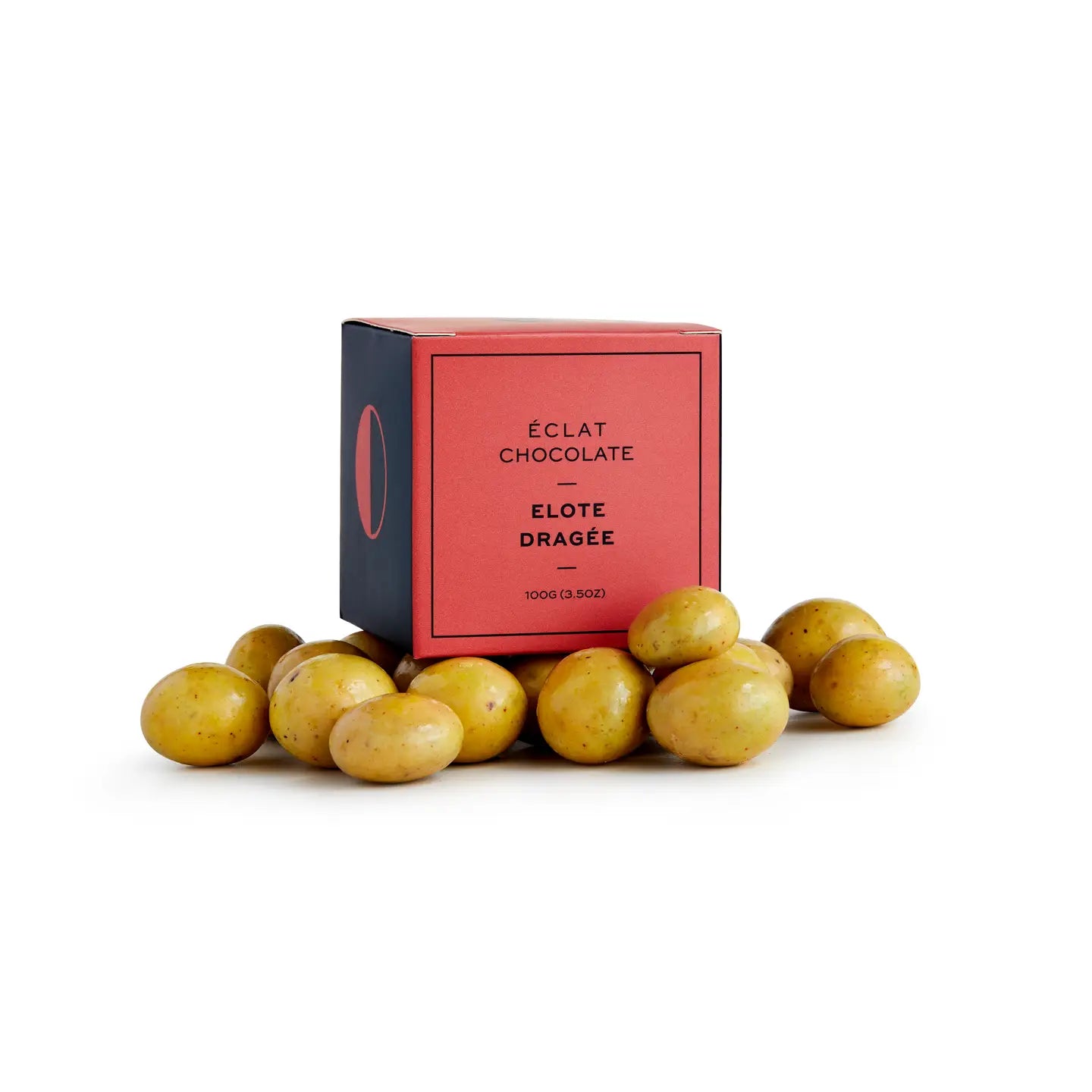 Elote Dragees feature dried corn covered in Éclat 60% dark chocolate blend, and white chocolate infused with lime, chili, and Cotija cheese.