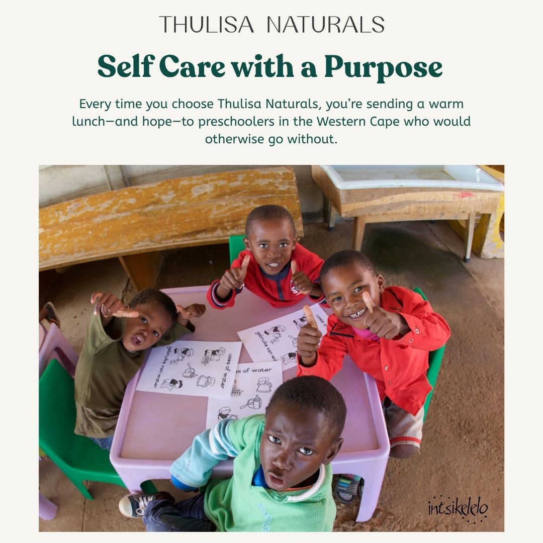 - Thulisa Naturals donates 10% of sale proceeds to provide nutritious meals to food-insecure preschoolers living in the Western Cape of South Africa
