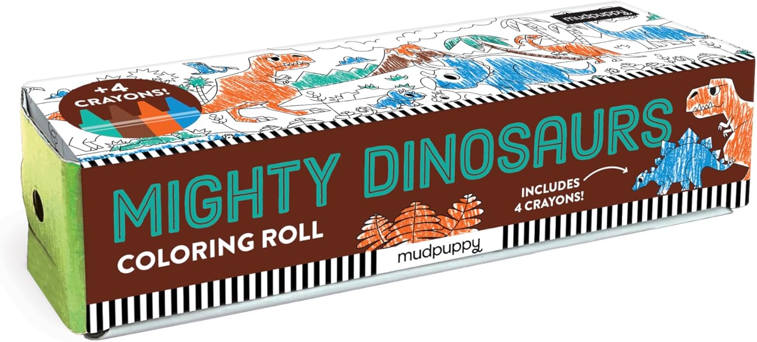 Enjoy creative fun with the Mighty Dinosaurs Mini Coloring Roll from Mudpuppy, featuring 30 continuous inches of prehistoric dinosaurs, waiting to be colored in! Perfect for travel and on the go fun, 5 crayons included! When you're done, simply roll the paper back inside.