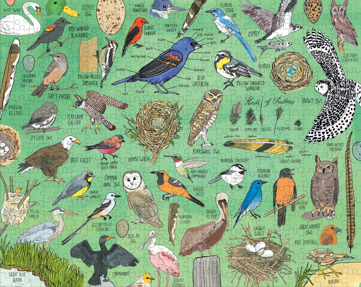 Learn how to identify different kinds of feathers, spot the difference between the eggs of a California Thrasher and Blue Jay, and understand the anatomy of a Blue Grosbeak; This puzzle is a hands-on educational challenge for adults, kids, or families – anyone interested in birds and the wonders of the natural world.
