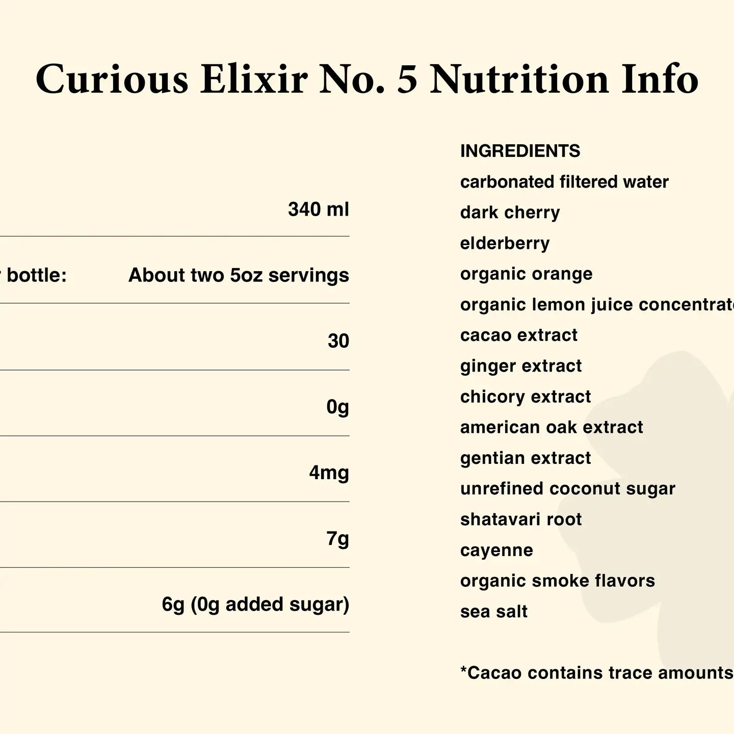 Rich dark cherry gives way to smokey American oak and dark chocolate, while a gentle burn lingers like your favorite stirred whiskey drinks. With no refined sugar and zero alcohol, Curious Elixir No. 5 is a bold booze-free craft cocktail that leaves you yearning for another sip in front of the fire, and wondering, "Why didn't I order more of these?" Enjoy stirred on the rocks, garnished with orange peel, cherry, or rosemary.