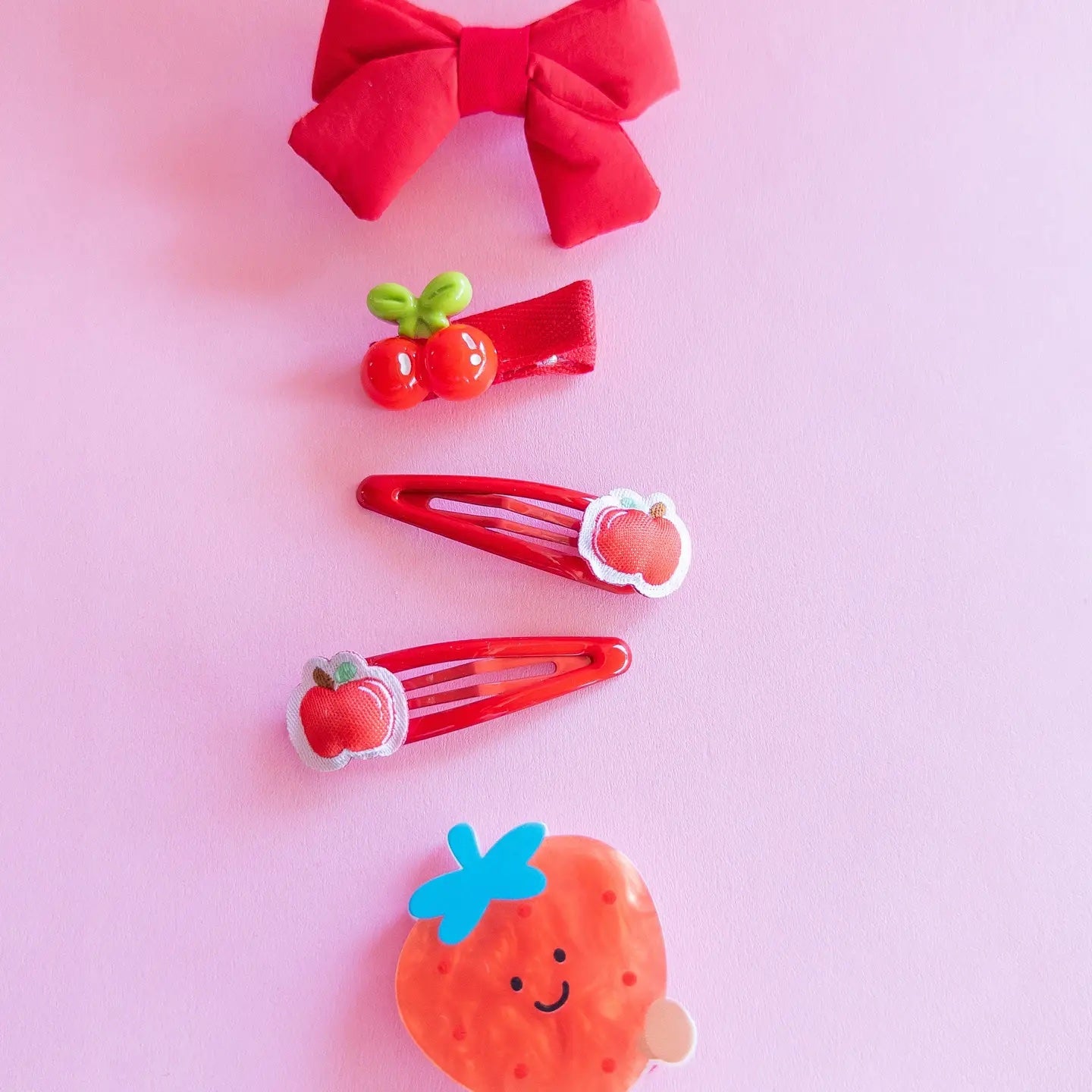 Add a pop of fruity fun to your hairstyle with our Strawberry Puffy Bow Set! This adorable 5-piece red toned hair clip set features a sweet and happy cartoon strawberry, ripe fabric apple snap clips, a juicy red cherry, and a puffy red bow.