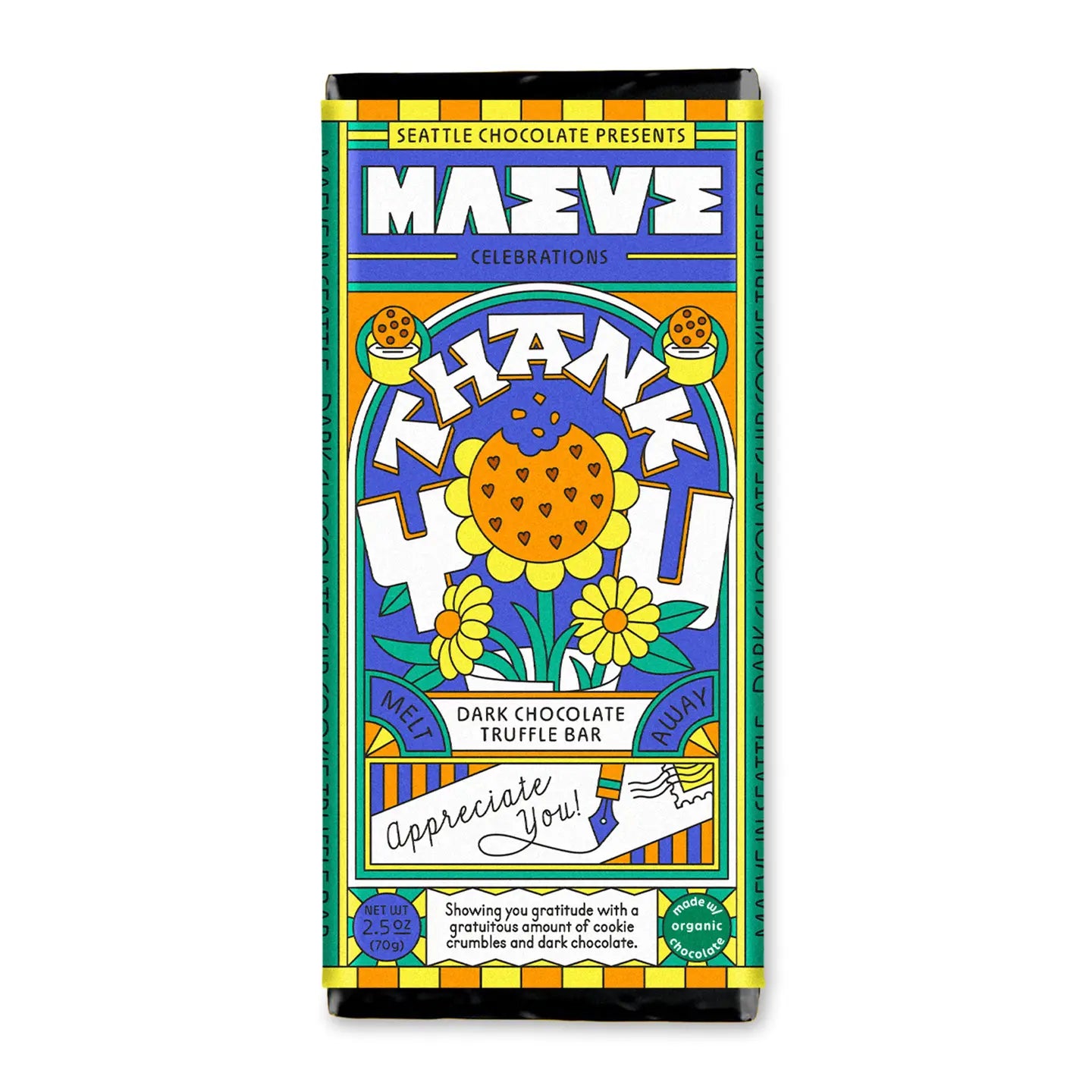 Maeve’s Thank You truffle bar is decadent dark meltaway chocolate brimming with gratitude AND packed with mini, crunchy chocolate chip cookie pieces. Made with organic chocolate.