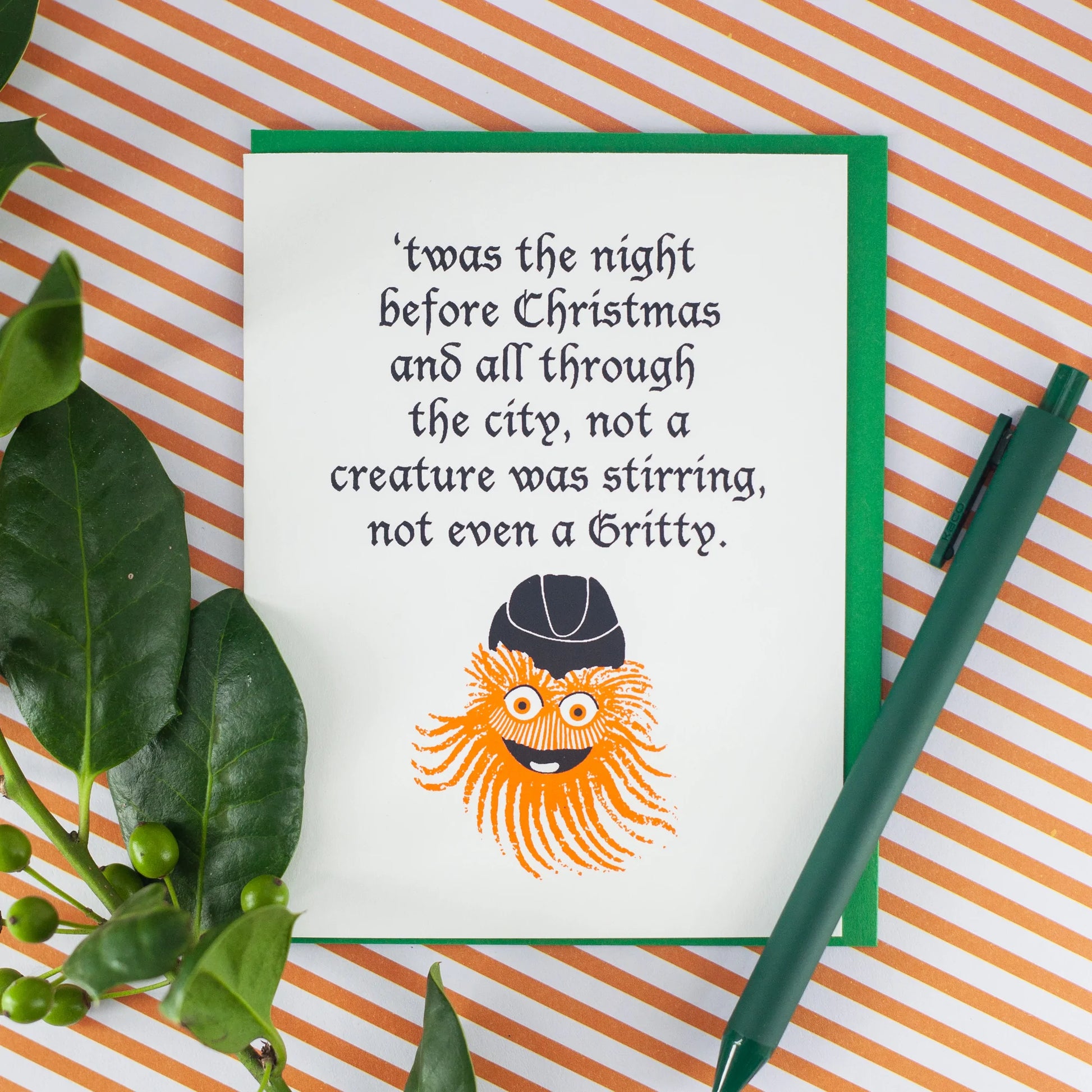 Inspired by the classic 'Twas the Night Before Christmas poem, this card is yet another ode to Philadelphia's favorite orange monster: Gritty! It borrows from the classic opening line of the poem, but with a Philly spin on it. What do you think Gritty leaves out on Christmas Eve? We're assuming it wouldn't be anything other than a city wide special followed by a late night cheesesteak (wiz wit, pls & ty).